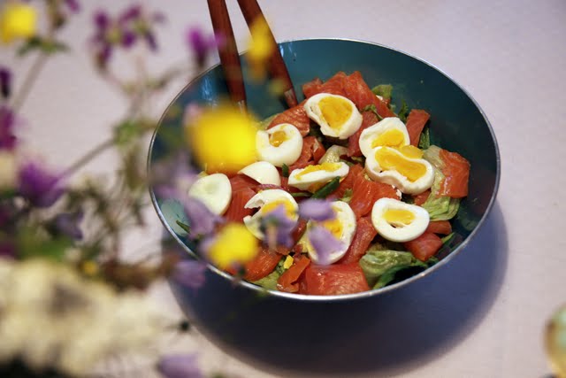 Han sto også for hovedretten, som var en deilig salat med masse godt i. Ørret, egg, avokado, sukkererter, tomat... Nam!